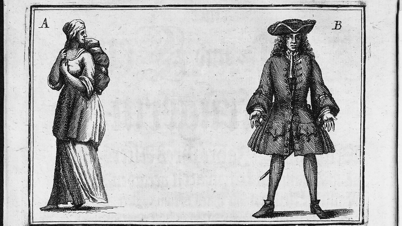 Motiv: Darstellung von Catharina Margaretha Linck einmal in Frauenkleidung und einmal in Männerkleidung (1720)